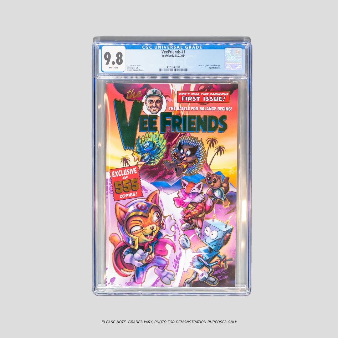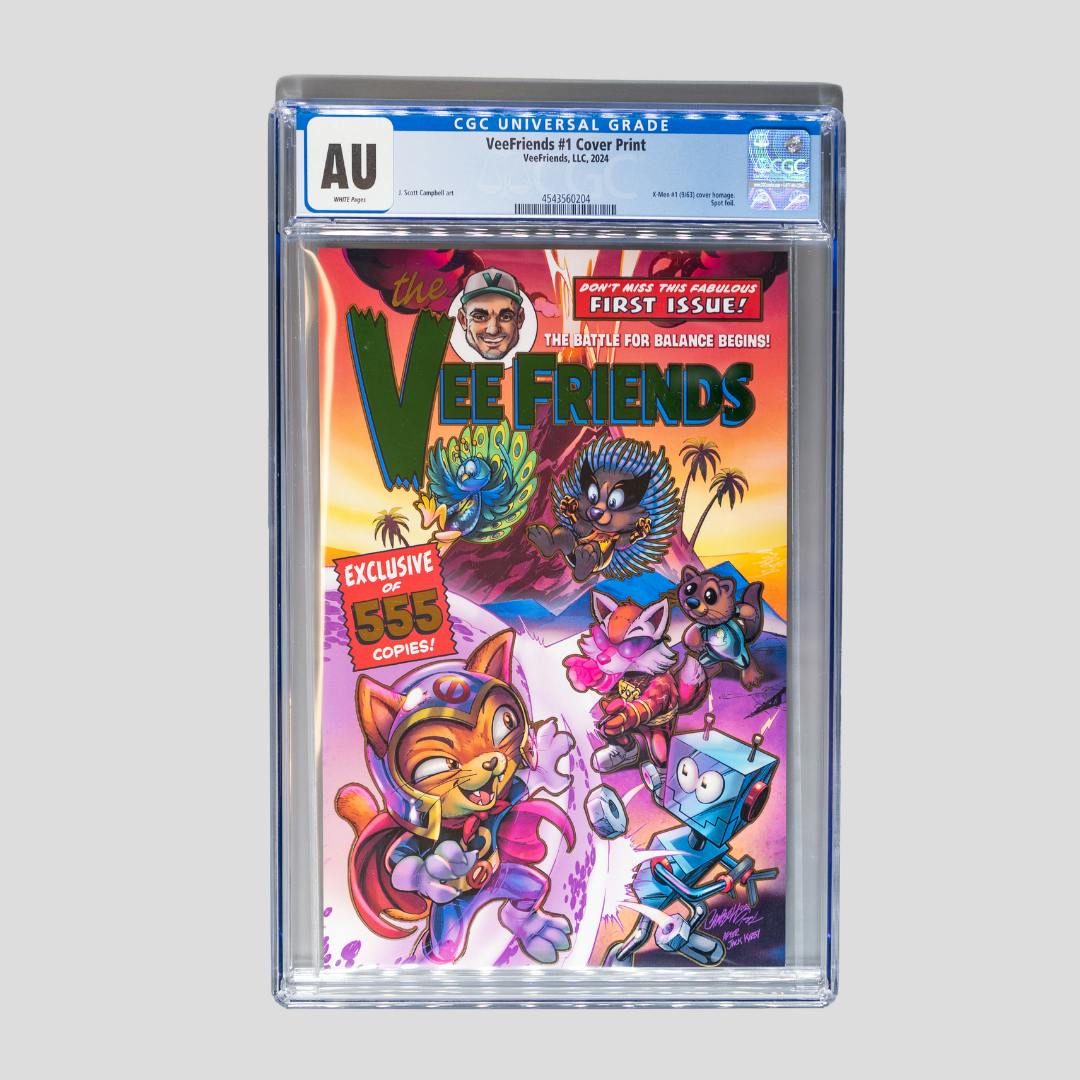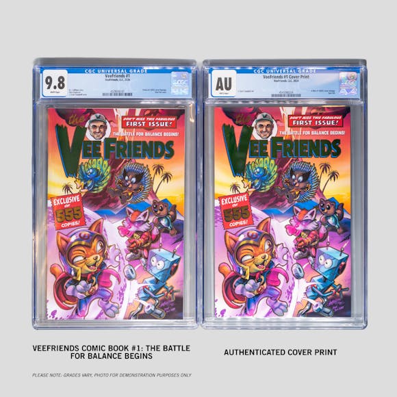 This collectible bundle was released with a total print run of just 555 copies. With seven subsequent comic books released at significantly larger print runs, Comic Book #1 remains the most limited, and the most historic issue in VeeFriends Comics.