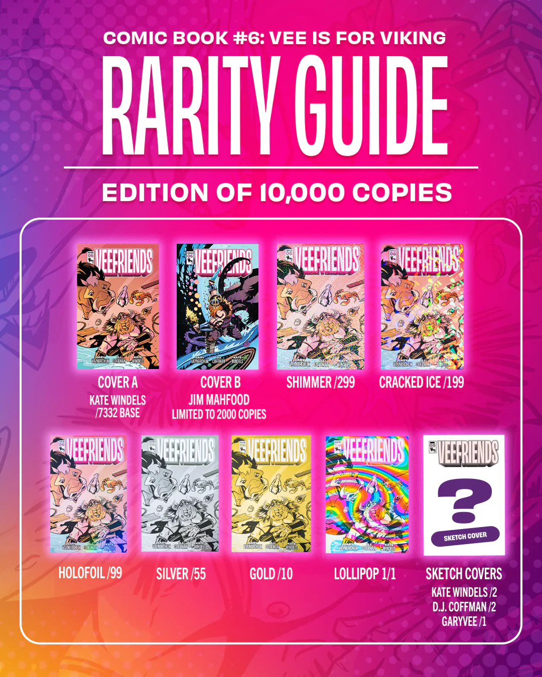 Each comic is sealed in their original blind-bag collector packs, with randomized cover variants and rare inserts. You can chase alternative artist covers, short-printed treatments, GaryVee sketch covers, and even the elusive 1/1 Lollipop variant.